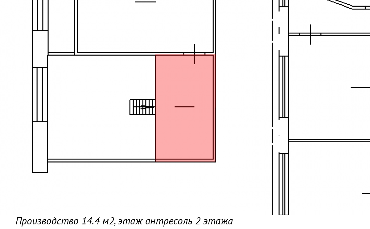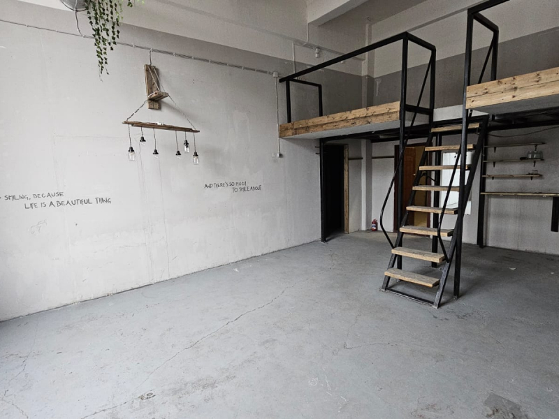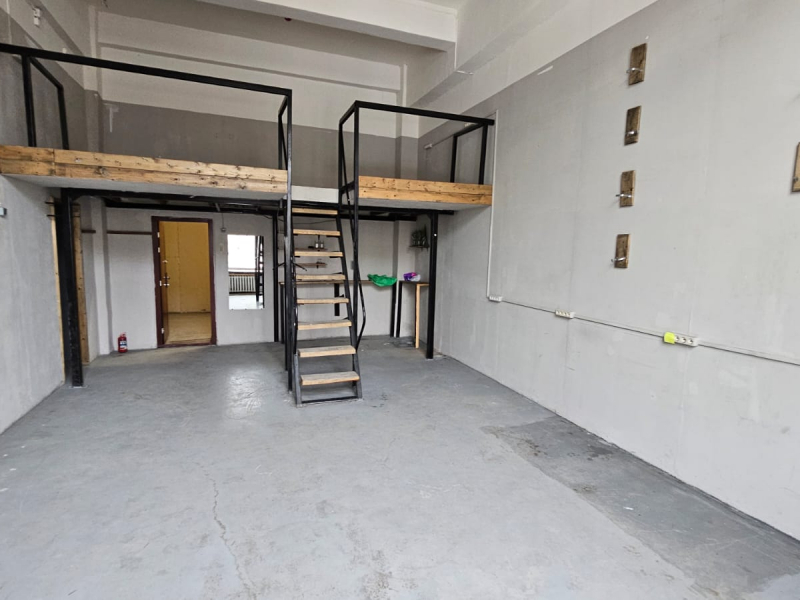 В помещении есть антресольный этаж, который позволяет разделить "чистые" и "грязные" производственные процессы или организовать склад материалов.